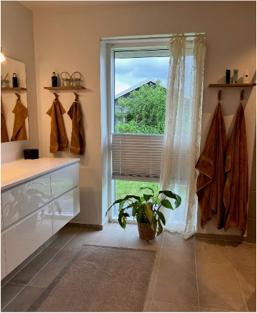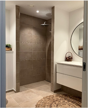 Badeværelserne er udført i en moderne og funktionel stil med lyse flader og tidløse materialer. Det store badeværelse rummer både en rummelig bruseniche og en elegant vaskeløsning med rene linjer.
